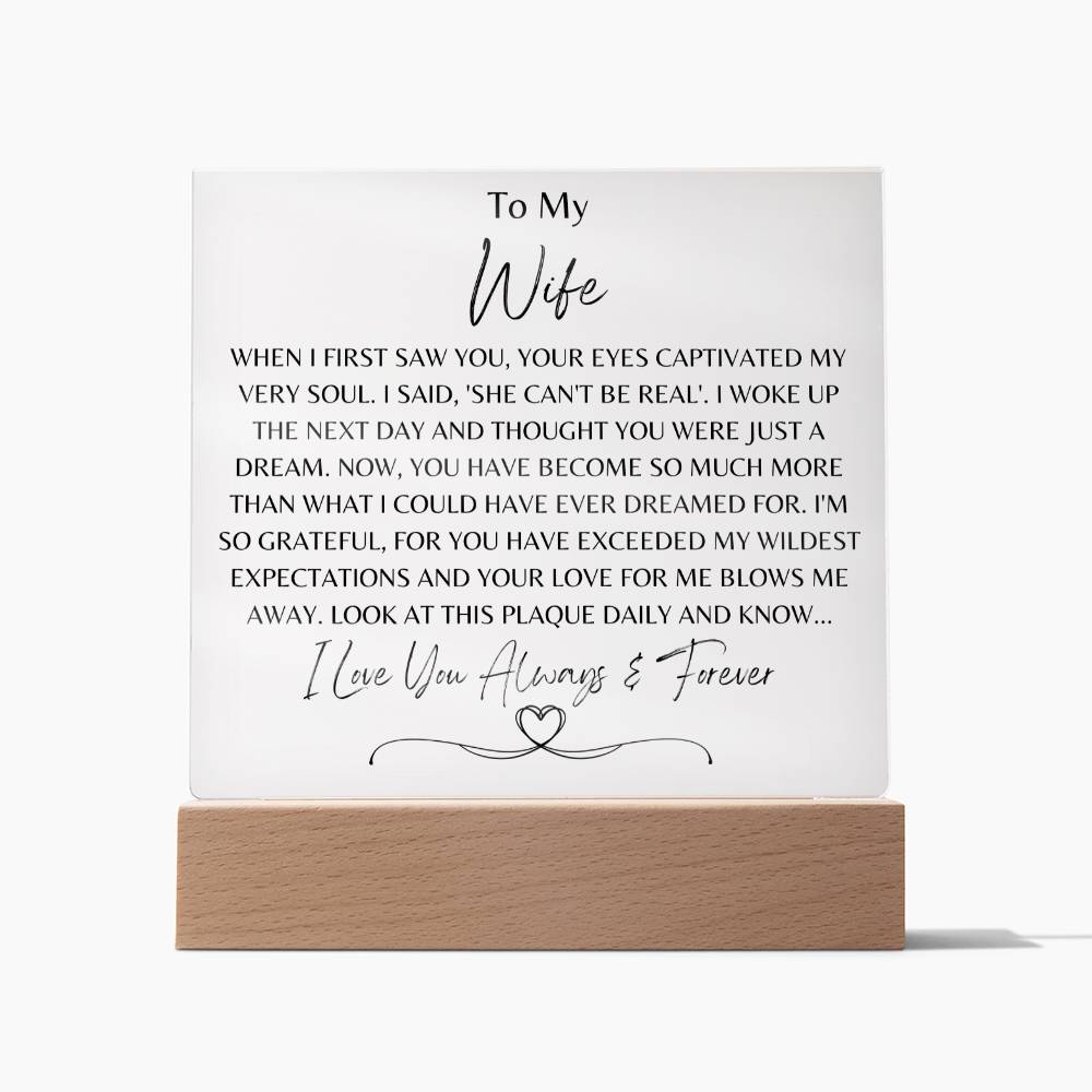WHEN I FIRST SAW YOU, YOUR EYES CAPTIVATED MY VERY SOUL. I SAID, 'SHE CAN'T BE REAL'. I WOKE UP THE NEXT DAY AND THOUGHT YOU WERE JUST A DREAM. NOW, YOU HAVE BECOME SO MUCH MORE THAN WHAT I COULD HAVE EVER DREAMED FOR. I'M SO GRATEFUL, FOR YOU HAVE EXCEEDED MY WILDEST EXPECTATIONS AND YOUR LOVE FOR ME BLOWS ME AWAY. LOOK AT THIS PLAQUE DAILY AND KNOW...